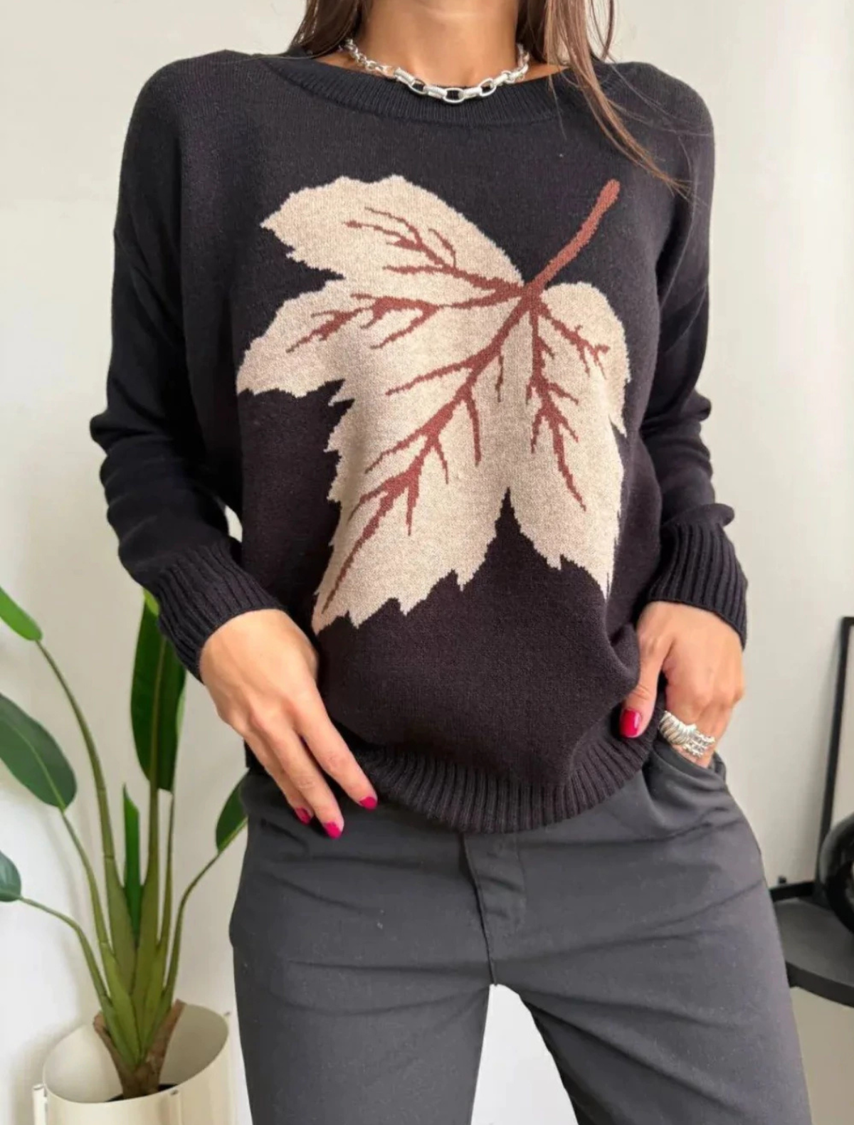 Un sweater cómodo y femenino que suma un detalle delicado al look diario. El diseño con hojas aporta un toque distinto y natural, ideal para quienes buscan una prenda abrigada pero con estilo.
